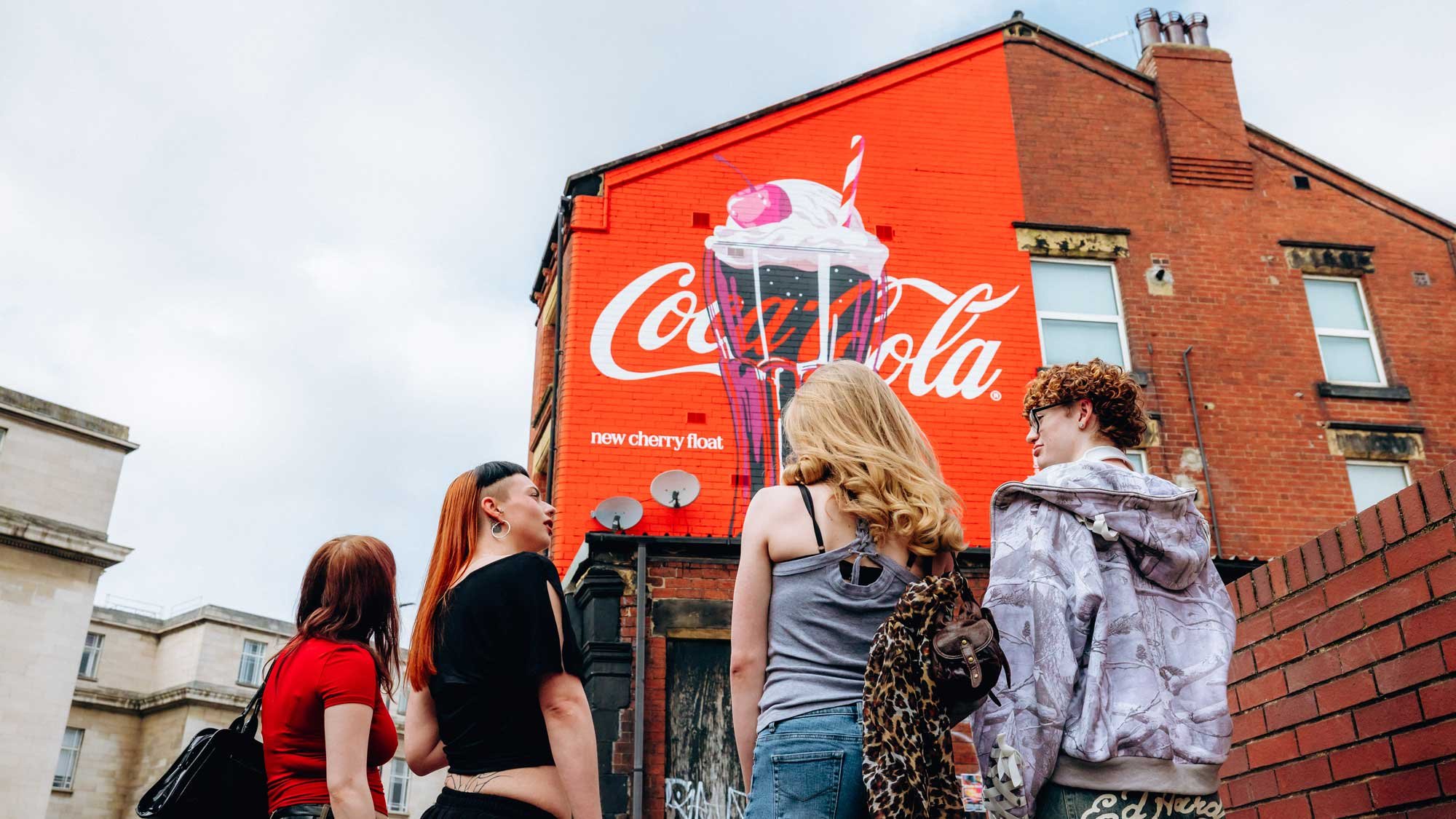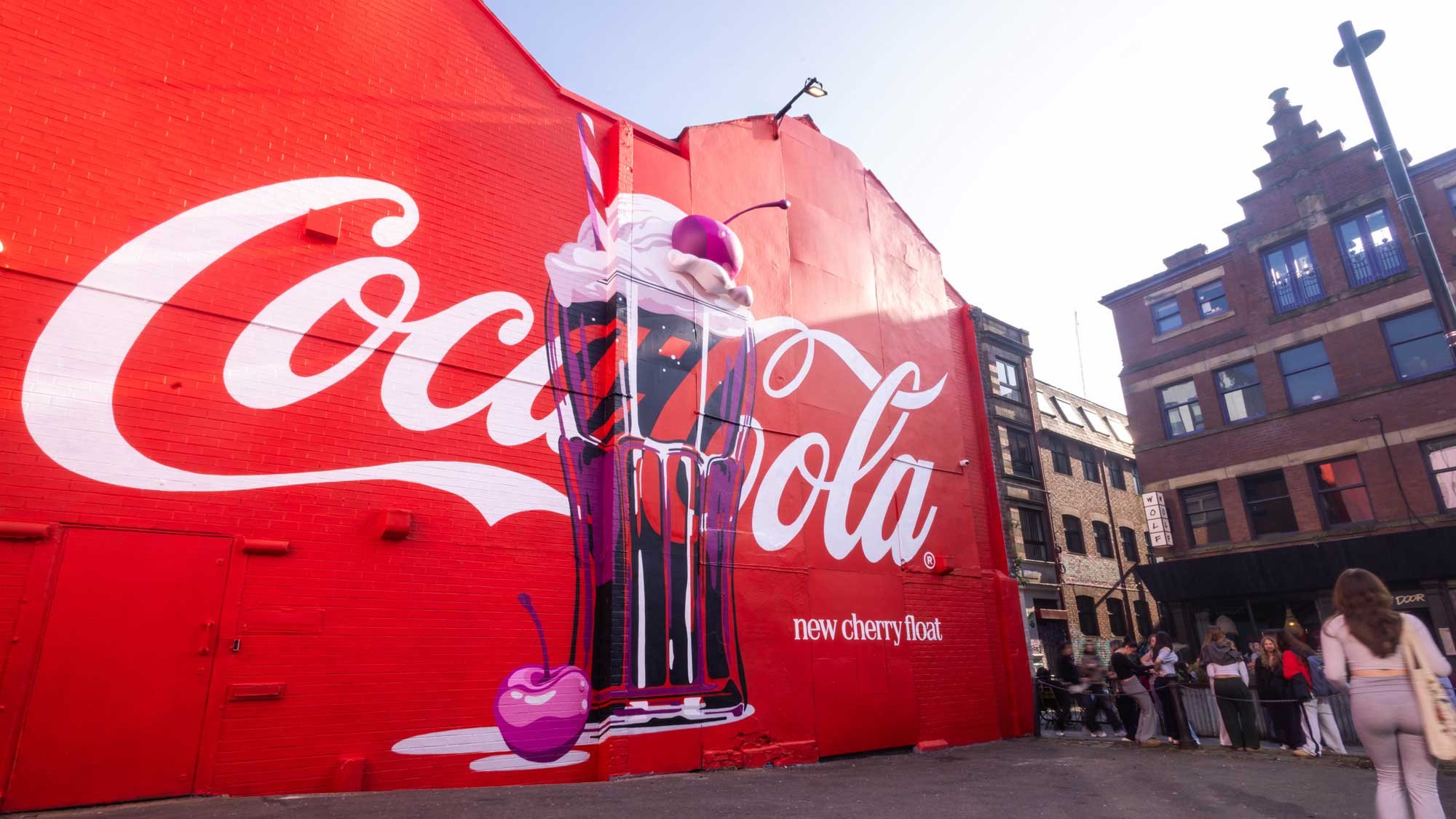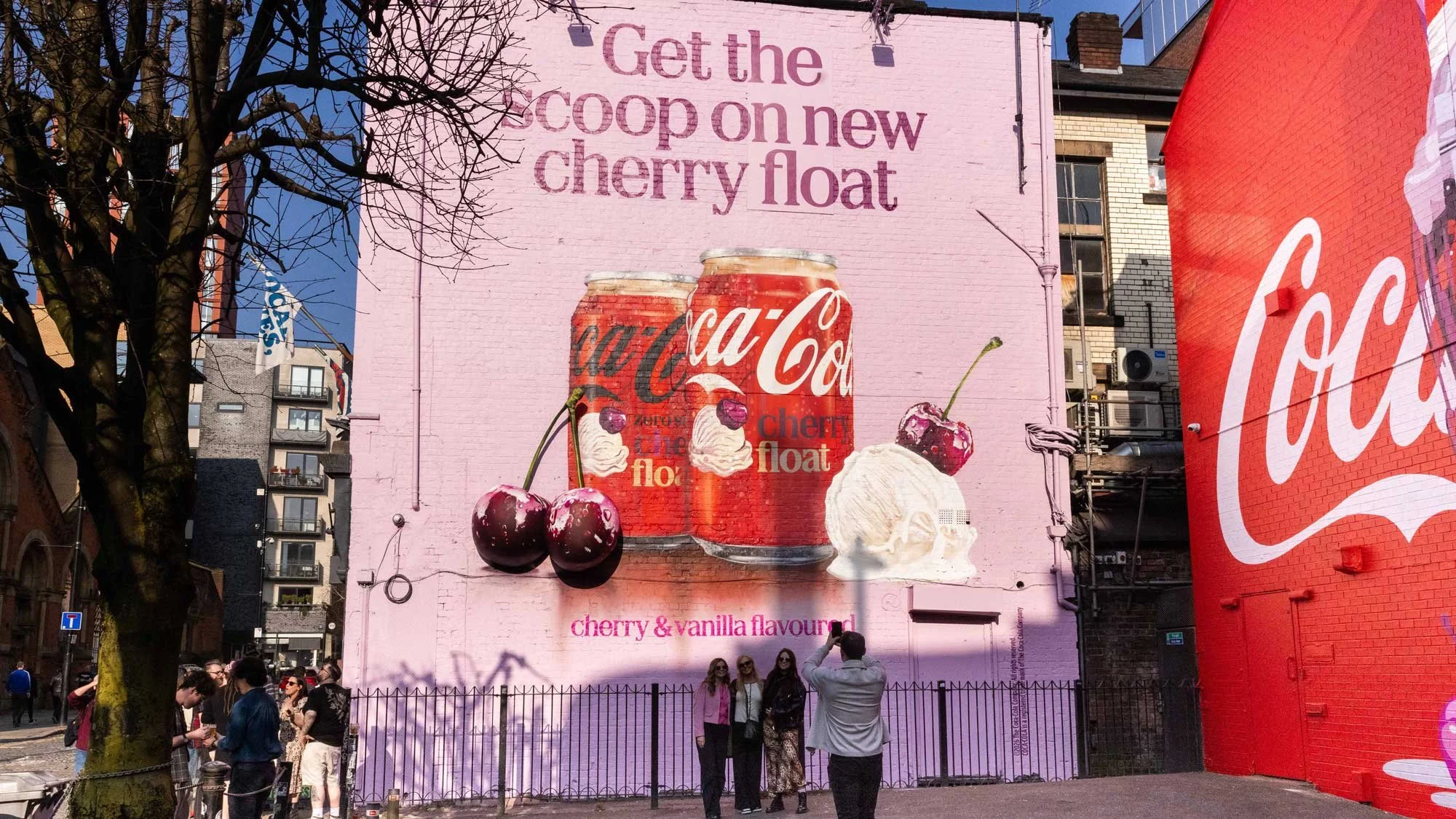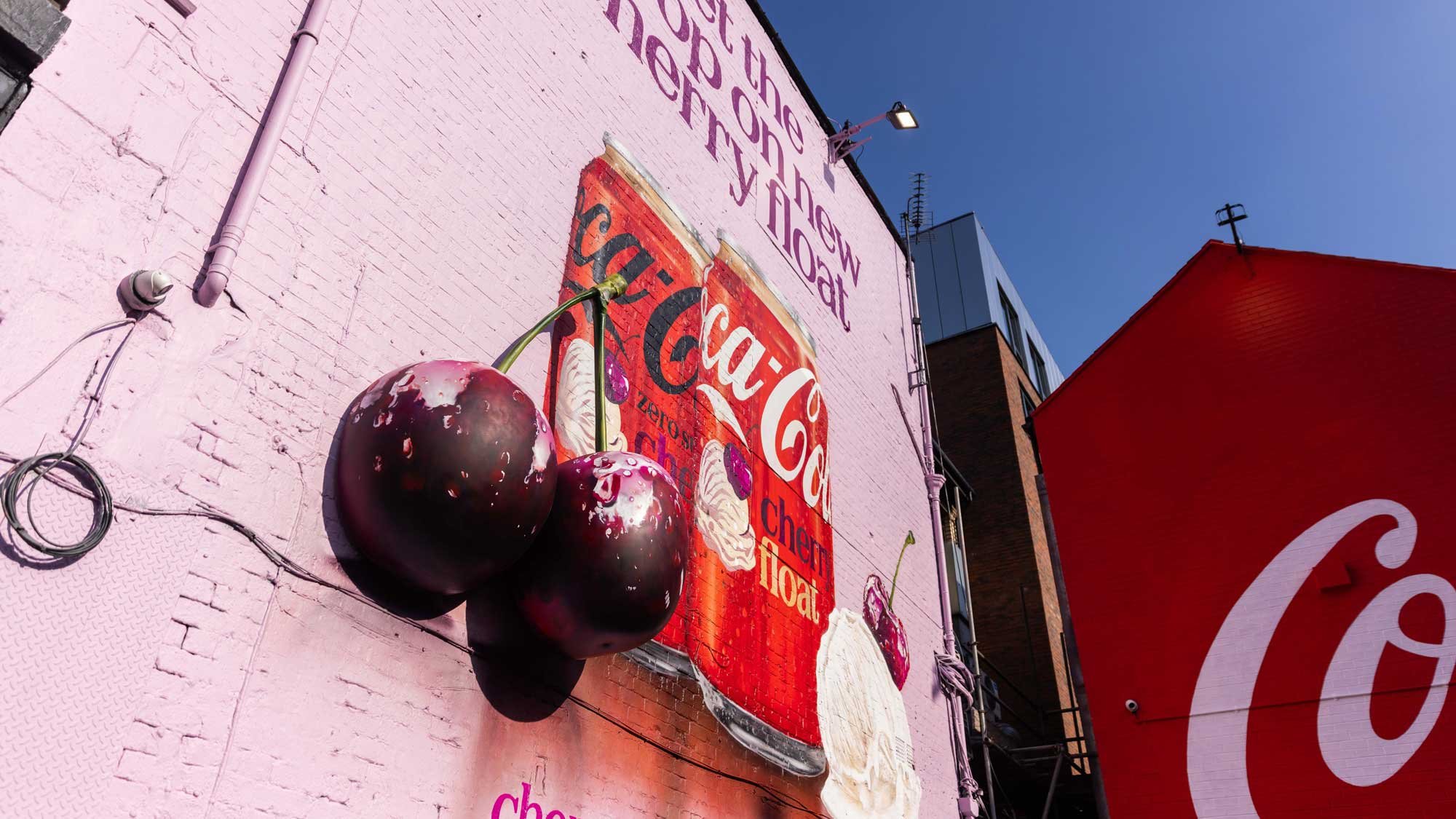 We painted these beautiful graphic paintings for Coca-Cola, to announce the launch of their new Cherry Float Flavour to the people of London, Manchester, Leeds and Liverpool. Inspired by the nostalgic taste of classic soda floats, this retro style of artwork was the perfect choice of painting to bring the product concept to life. Timed perfectly for the weather turning and the blossom blooming only increased the impact. In Manchester, the addition of 3D cherries to both walls, added to this must have photographic backdrop drawing additional crowds to gather in the Spring sunshine.