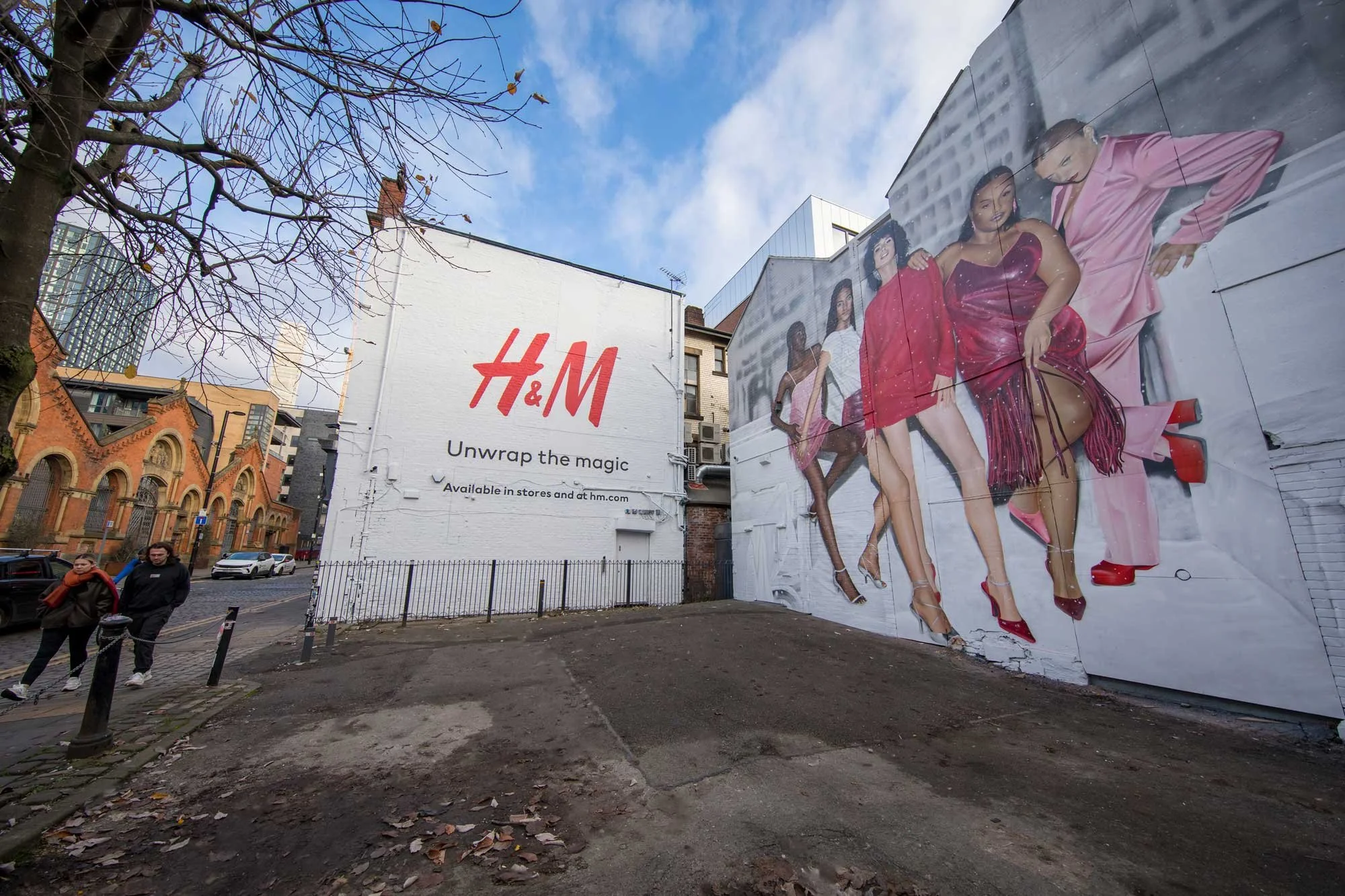 We painted this stunning dual aspect mural for H&M’s “Unwrap the Magic” Christmas campaign in the heart of Manchester’s Northern Quarter showing off 5 of their models wearing items from H&M’s Christmas party range.
