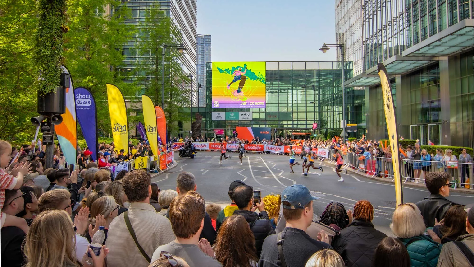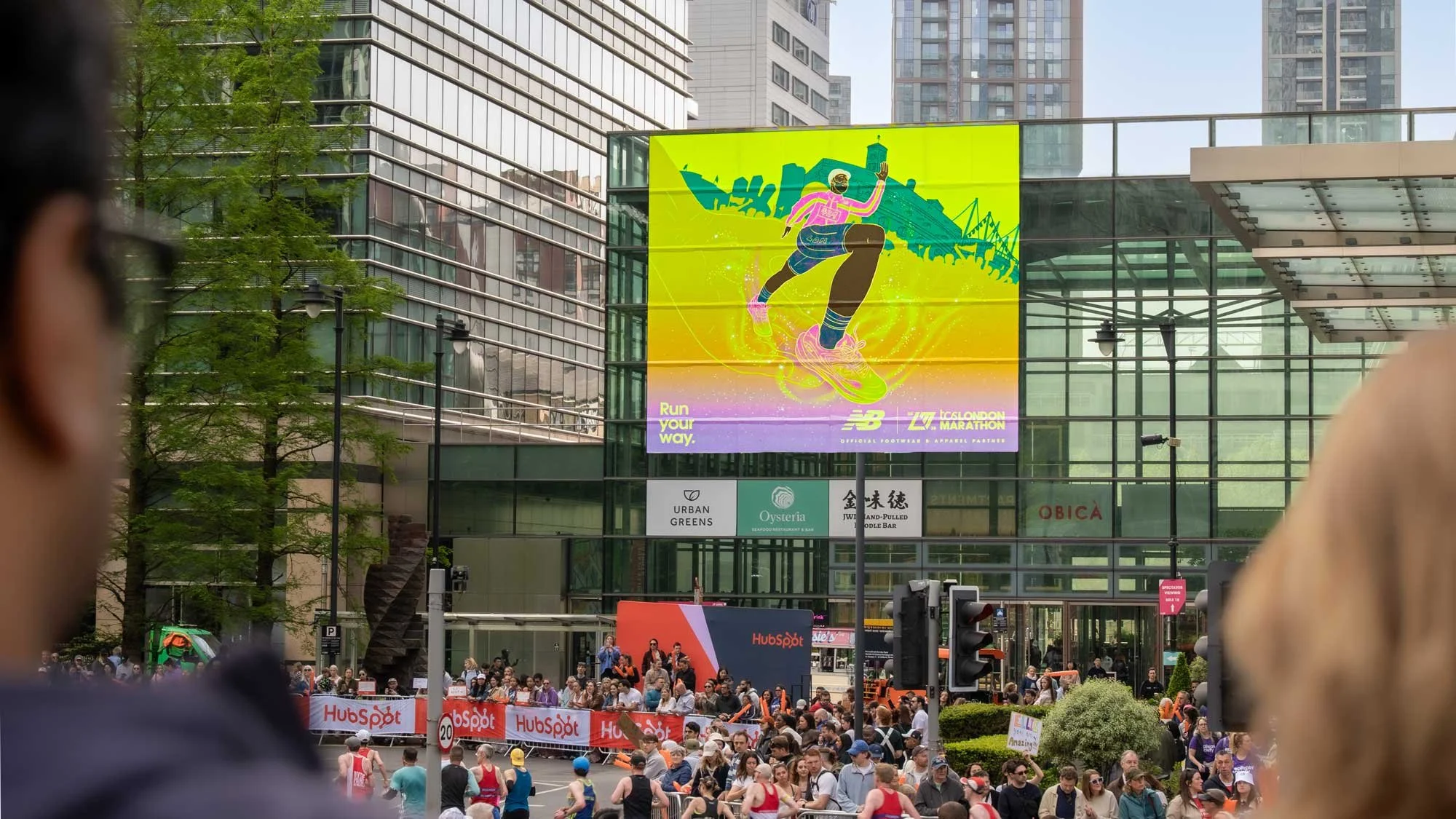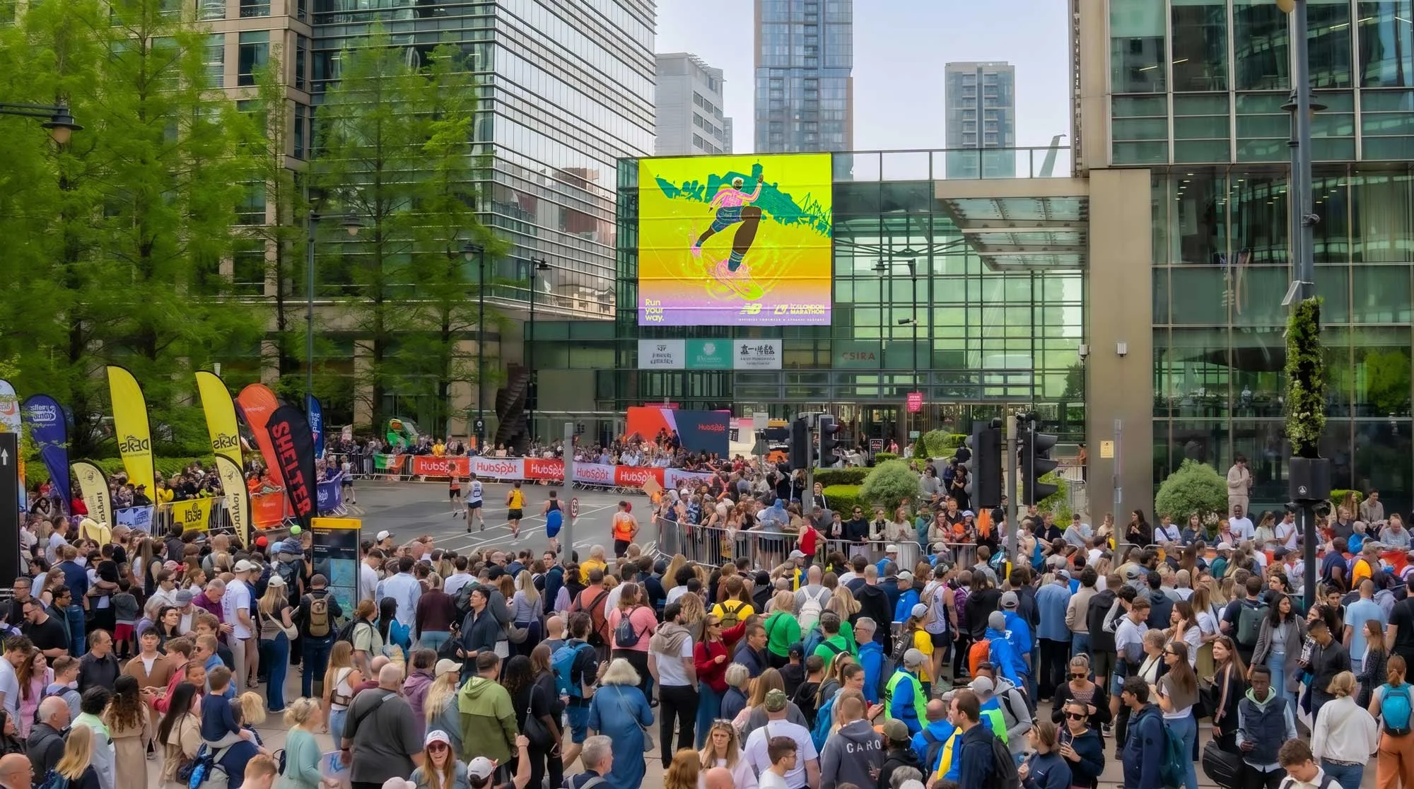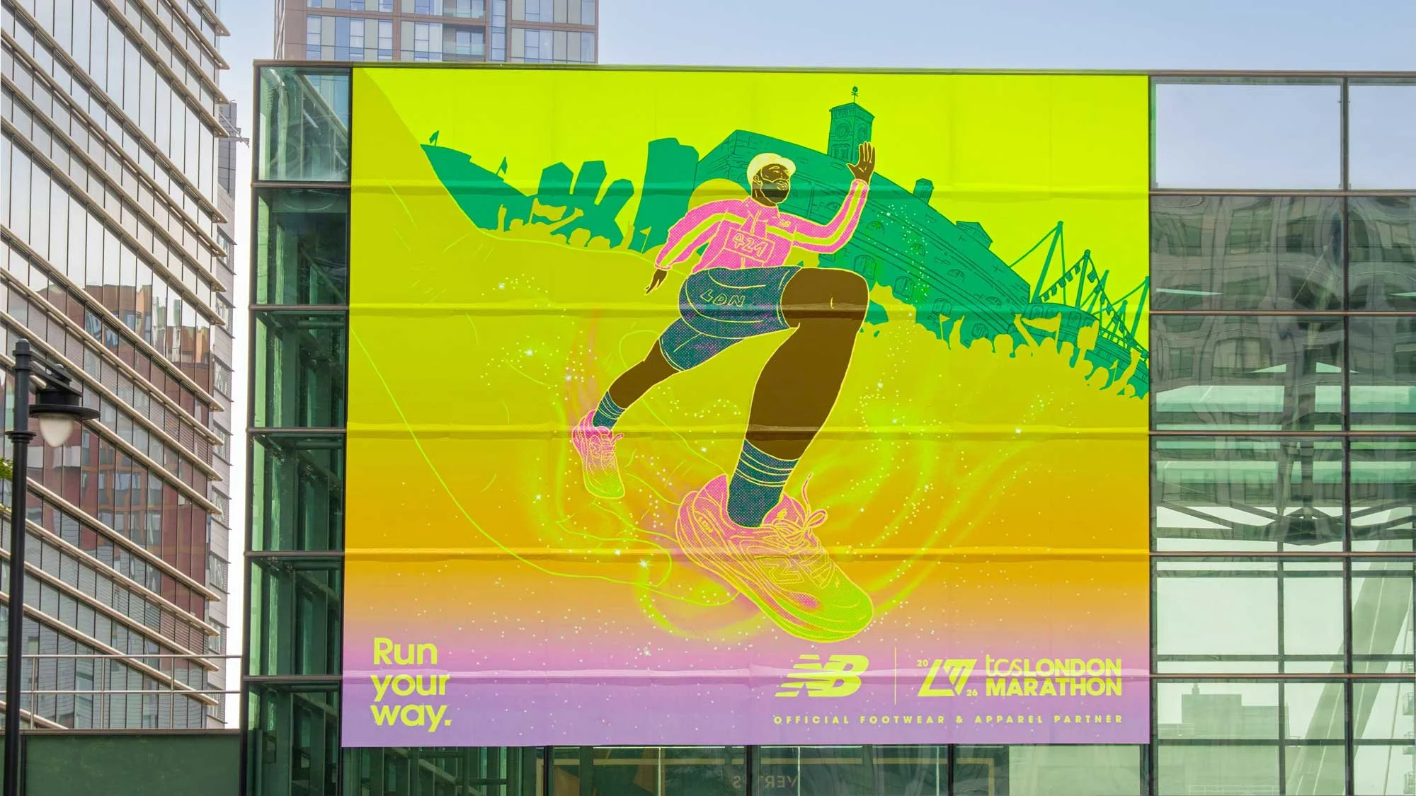 The New Balance “Run Your Way” campaign, continued to champion individuality in running around the 2026 London Marathon. We painted this highly visible bright graphic mural for them on our new canvas in the heart of Canary Wharf, right in the heart of the action. This location is both the ultimate spot to cheer on tired legs at the 18 mile point, and for their supporters to spur them on. The artwork featured the New Balance Ellipse and was visible to crowds in all directions.