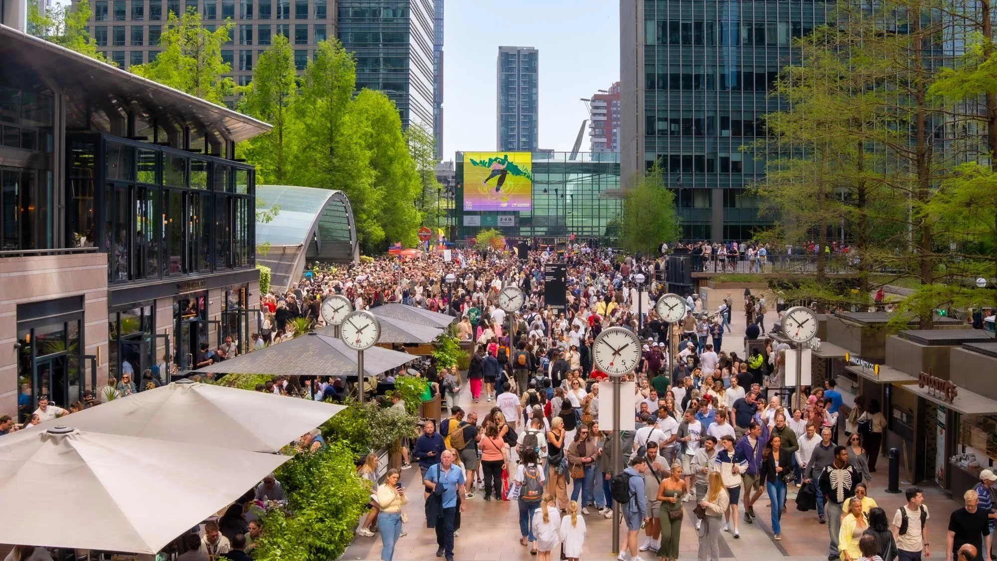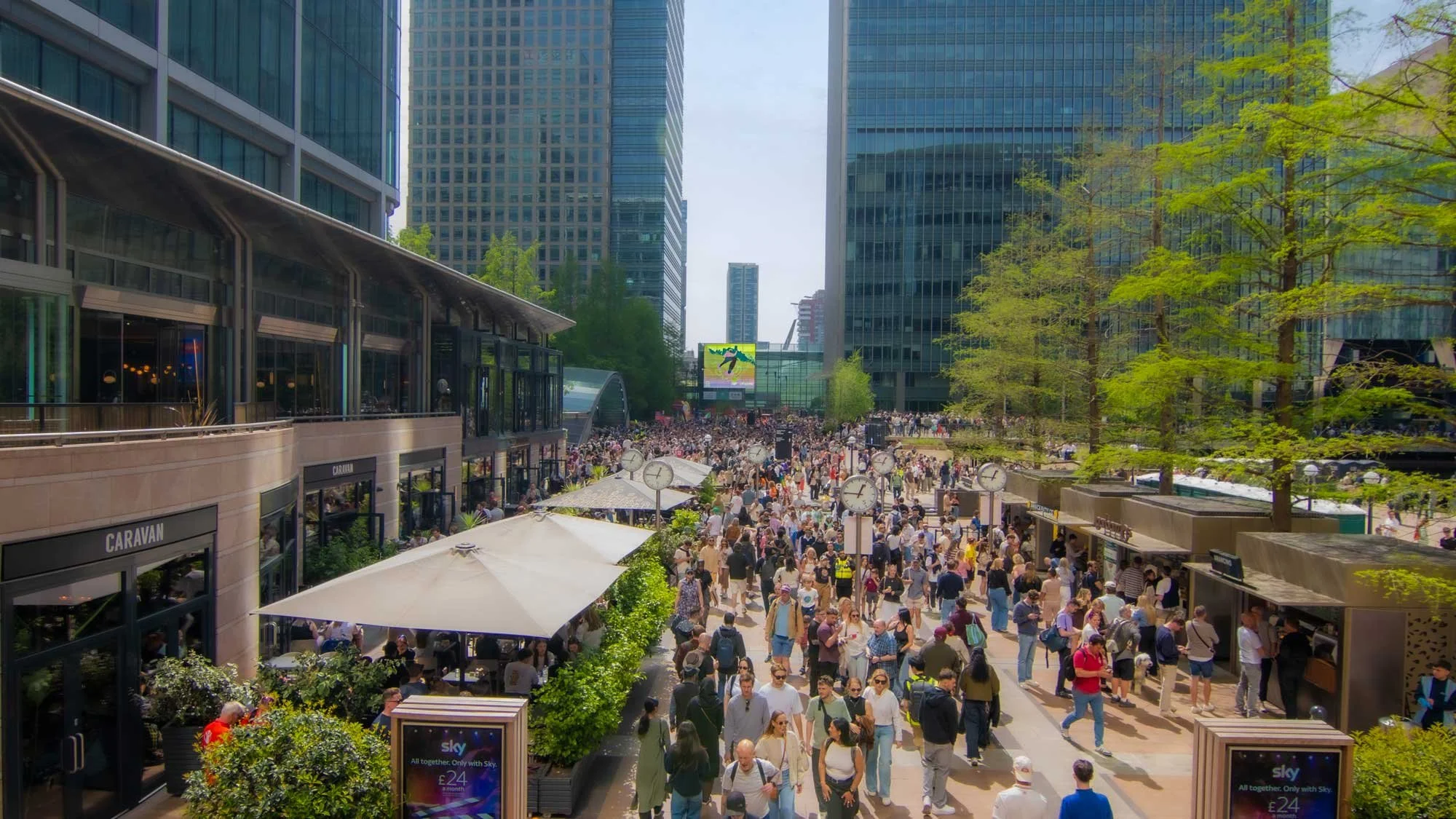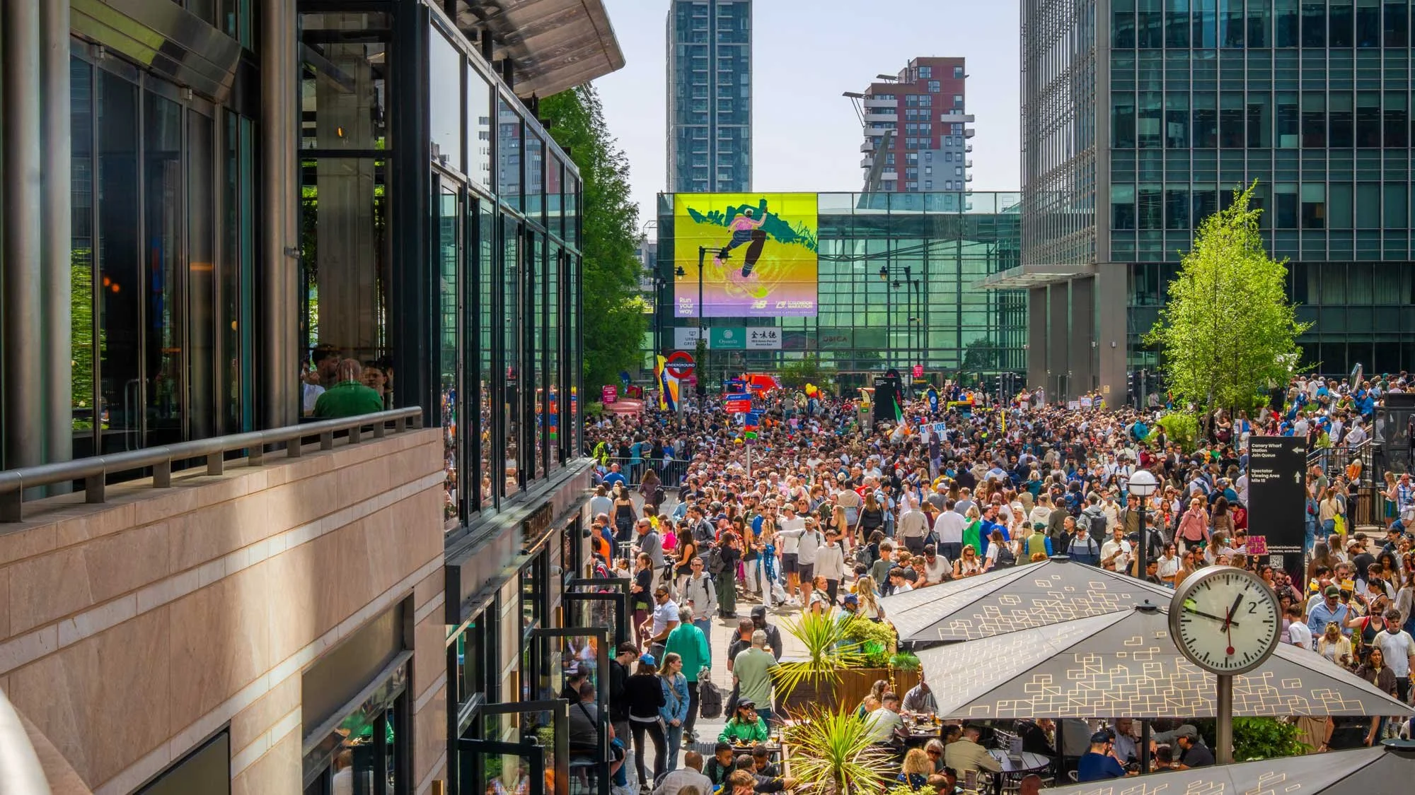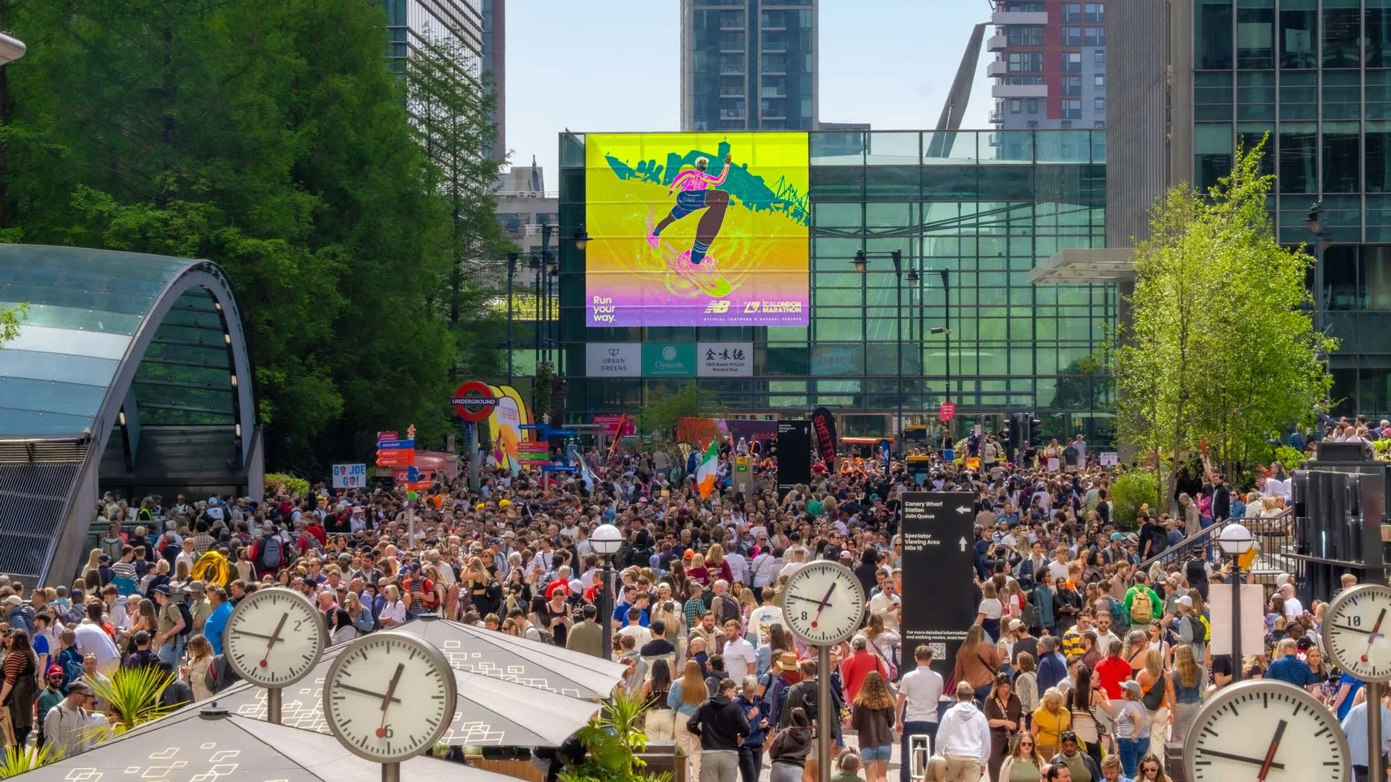 The New Balance “Run Your Way” campaign, continued to champion individuality in running around the 2026 London Marathon. We painted this highly visible bright graphic mural for them on our new canvas in the heart of Canary Wharf, right in the heart of the action. This location is both the ultimate spot to cheer on tired legs at the 18 mile point, and for their supporters to spur them on. The artwork featured the New Balance Ellipse and was visible to crowds in all directions.